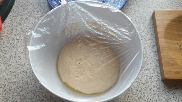Der Teig vor und nach dem Aufgehen (hat sich schön verdoppelt) und die Pizza vor und nach dem Backen.