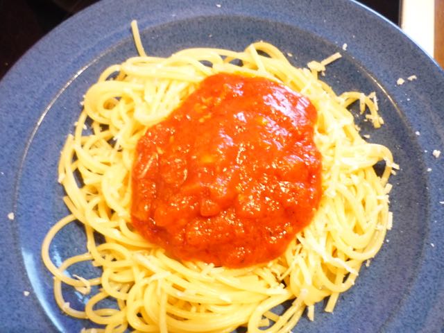 Eigentlich mache ich meine Tomatensauce schon lange so oder so ähnlich. Neu waren jetzt die Chiliflocken, die geben ordentlich Schärfe, obwohl ich sie sparsam eingesetzt habe.