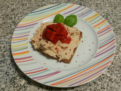Und das wie im Restverwertungs-Tipp auf Brot gegessen. Dekoriert mit gegrilllter Paprika. So waren die Bohnen und Papriakreste von der Karotten-Paprika-Suppe von Seite 197 versorgt.Die Bohnencreme braucht ordentlich Pfeffer und Salz, sonst schmeckt sie nach nix. Zusätzlich habe ich sie mit Pul Biber bestreut.