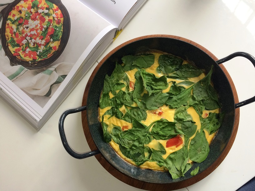 Da meine Pfanne für den Ofen nicht eiertauglich ist, die hängen gerne fest, habe ich die Zutaten in der Pfanne auf dem Herd gemacht und nach dem Stocken den Deckel drauf, damit der Rest auch fertig wird.