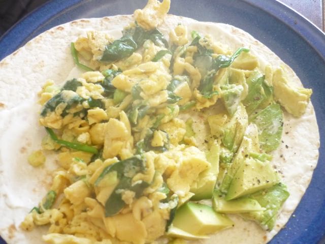 Dazu das Rührei mit dem Gemüse und die Avocado. Ein bisschen Zeit braucht es schon aber es ist lecker und macht für ein paar Stunden satt.