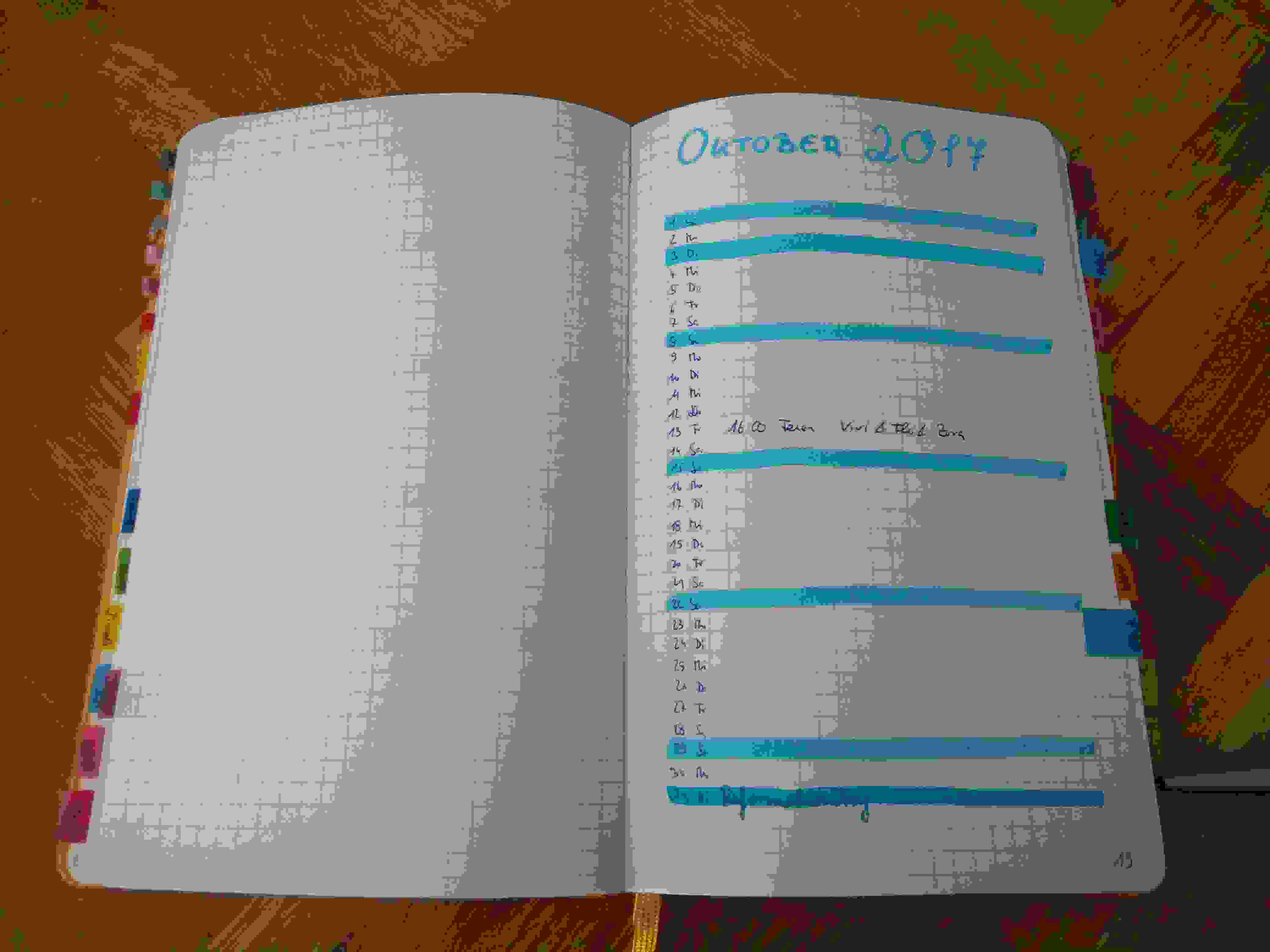 Im Internet gibts ja auch massiv Anregungen! Super, aber da muss man schon aufpassen, dass man a) nicht erschlagen wird und b) nicht abgeschreckt. Deshalb werde ich es sehr auf MEINE Bedürfnisse anpassen, also z. B. nur minimal gestaltet und auf das Wichtigste (für mich) beschränkt. Deshalb auch keine extra Tagespläne u. ä.