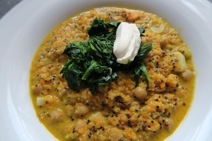 Quinoa-Risotto mit Erbsenpüree und Blattgemüse S. 96