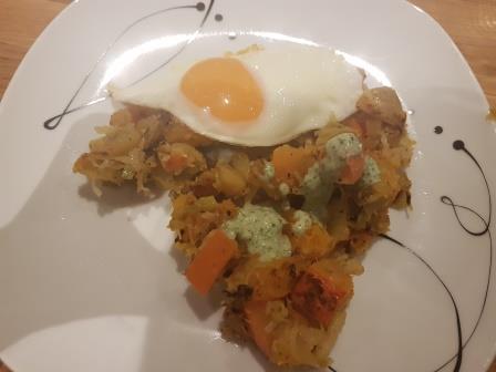 Die Kartoffeln und den Kürbis habe ich etwas länger köcheln lassen, danach wie im Rezept schön knusprig angebraten und etwas Bergkäse dazu gegeben. Die Spiegeleier habe ich in einer extra Pfanne angebraten.