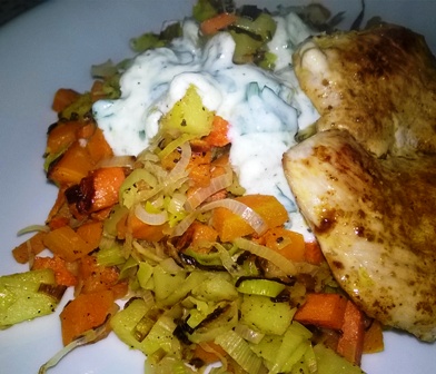 Das Kräuter-Lauch-Dressing hat mir zu dem Gemüse nicht geschmeckt, aber dafür richtig lecker zu den kleinen Putenschnitzeln, die es statt Spielgeleiern zu dem Gemüse gab.