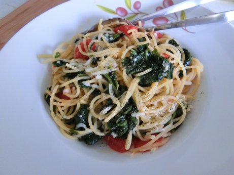 Ich habe Spaghetti und Tafelsalz verwendet, mein Grünkohl war tiefgefroren und statt Parmesan habe ich etwas Gouda darüber gerieben.