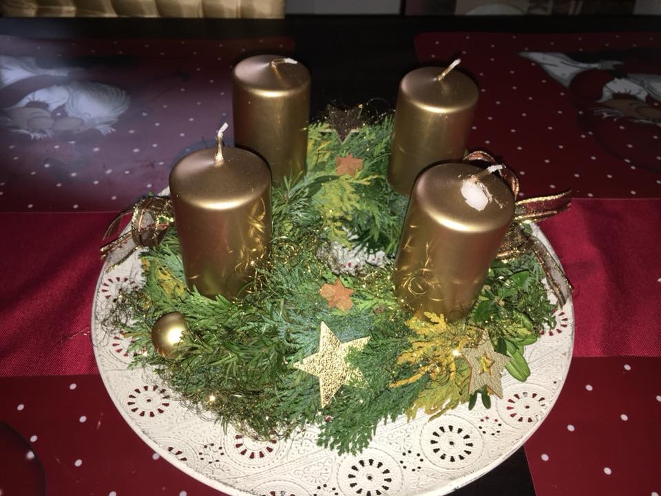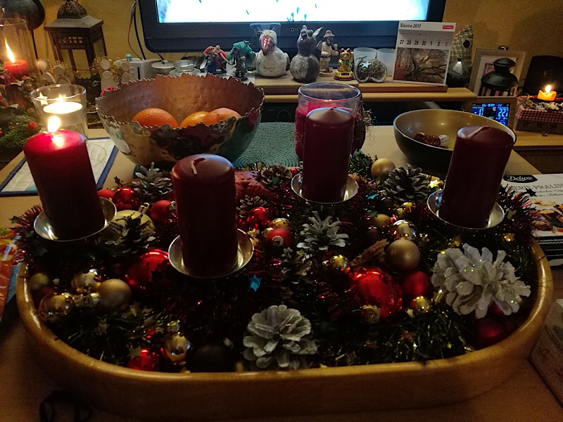 Ich selber habe seit zwei Jahren keinen eigenen Kranz mehr, weil ich mit meinen beiden Chaoskatzen kein offenes Feuer mehr machen kann. Dafür beteilige ich mich am Kranz meiner Eltern und da feiern wir dann die Adventsstunde (und ja, da gibts dann auch die Plätzchen