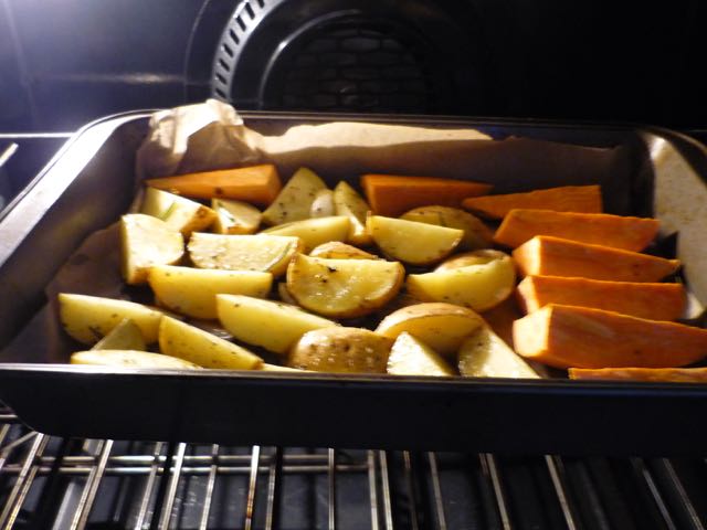 Zum restlichen Boeuf heute also die Rosmarinkartoffeln. Da das keine neuen Kartoffeln waren habe ich sie geviertelt. Fürs Kind auf der Seite ein paar Süßkartoffeln. War sehr lecker und einfach.