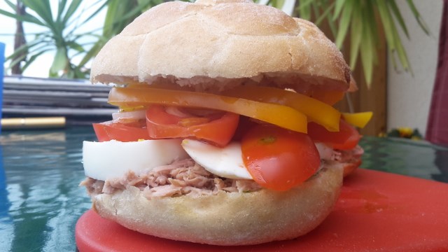 Das funktioniert am besten, wenn man das Pan Bagnat mit einer Brottüte umwickelt isst – so, wie man es auch an den Straßenständen erhält. Ansonsten hilft nur zusammendrücken, bis es kleckert. Also: Servietten bereithalten ...