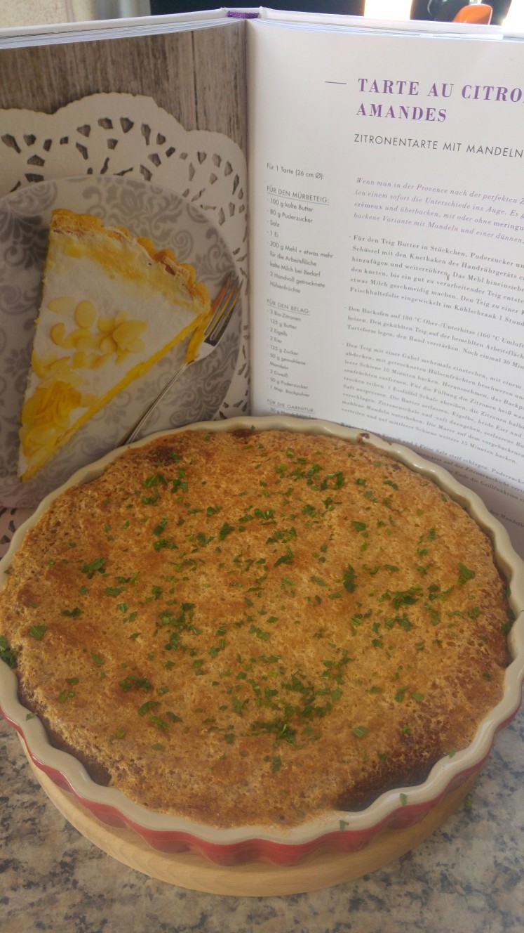 Durch das Backen wurde die Tarte von alleine braun und musste gar nicht grillen. Für meinen Geschmack wurde sie sogar zu braun. Die Tarte im Kochbuch sieht irgendwie anders aus.