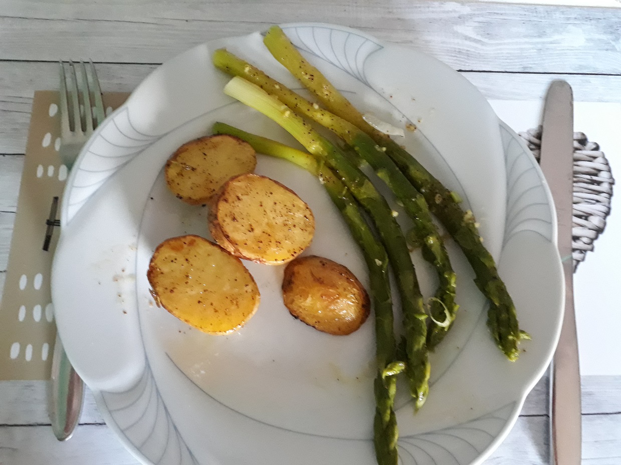 den Spargel habe ich zusammen mit den Kartoffelwürfeln für die gebratenen Kartoffeln im Thermomix gegart, so ist das eine sehr schnelle Sache. Das Ergebnis kam gut an und hat auch abends kalt noch lecker geschmeckt.