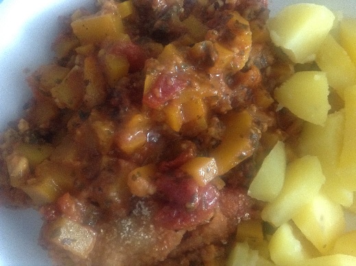 Ich habe nur eine Knoblauchzehe genommen, gefrorene Petersilie und Kräuter der Provance da ich keinen Thymian mehr hatte.Käse hatte ich noch einen Rest geriebenen Gauda. Statt der Tomaten habe ich eine Dose mit gestückelten Tomaten genommen. Dazu habe ich Salzkartoffeln gemacht ,