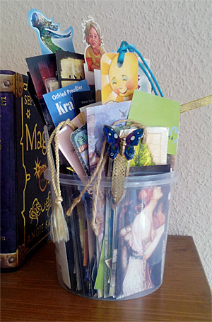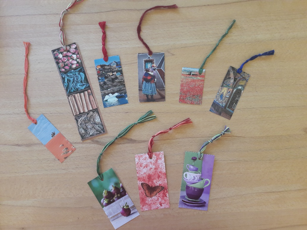Ich habe heute mal die winzigen Reste meiner einst recht umfassenden Lesezeichensammlung aus den Regalfächern zusammengekratzt. Früher, als ich noch jung war und viel Zeit hatte, habe ich mir zu jedem Buch, das ich gelesen habe, ein passendes Lesezeichen ausgesucht - und wenn kein passendes da war, habe ich mir eins gebastelt. (Meistens ganz schlicht aus alten Kalenderbildchen mit Wollbändel.) Nun, wo ich immer mehr eBooks lese und es fast schon wieder etwas Besonderes ist, ein gedrucktes Buch auf dem Lesekissen liegen zu haben, möchte ich gern zu dieser Tradition zurückkehren. Ein paar neue Lesezeichen haben heute schon das Basteleckchen verlassen und warten auf ihren Einsatz, ein paar "alte" passen bestimmt auch zu neuen Leseerlebnissen.