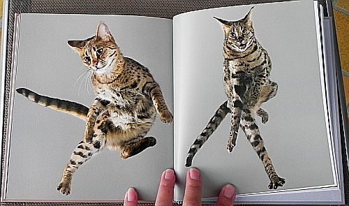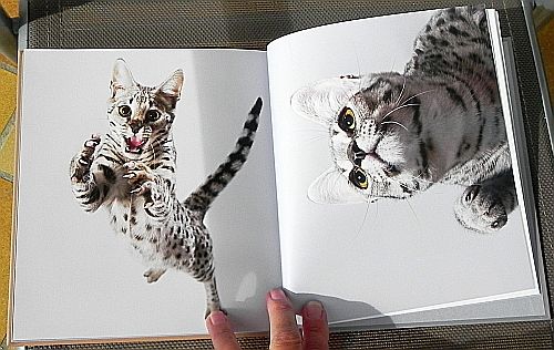 Falls das Buch je in den USA erscheinen sollte, wird man bei den Nacktkatzen wohl ein Höschen ins Bild hineinretuschieren müssen. Oder einen schwarzen Balken. Bei Nacktheit versteht man dort nämlich keinen Spaß. Und bei den Tieren auf den Seiten 94/95 und 102 fehlt die Rassenangabe. Ich hab unter dem Züchternamen nachgeschaut: Es sind Bengalen.