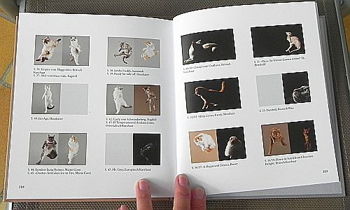 Die Fotoseiten sind nicht paginiert und enthalten auch keinerlei erklärenden Text. Man sieht also wirklich nur die Bilder. Wer hier wer ist und welcher Katzenrasse die Models jeweils angehören, erfahren wir auf den Seiten 116 – 124. Da sind die Doppelseiten nochmals in Briefmarkengröße abgebildet und darunter steht, wer auf den Bildern zu sehen ist. Wenn man von der Übersicht zu einem bestimmten großen Foto zurückblättern und will, wird’s allerdings ein bisschen mühsam. Denn, wie gesagt, die Fotoseiten haben keine Seitenzahlen. Die Sucherei ist ein wenig lästig.