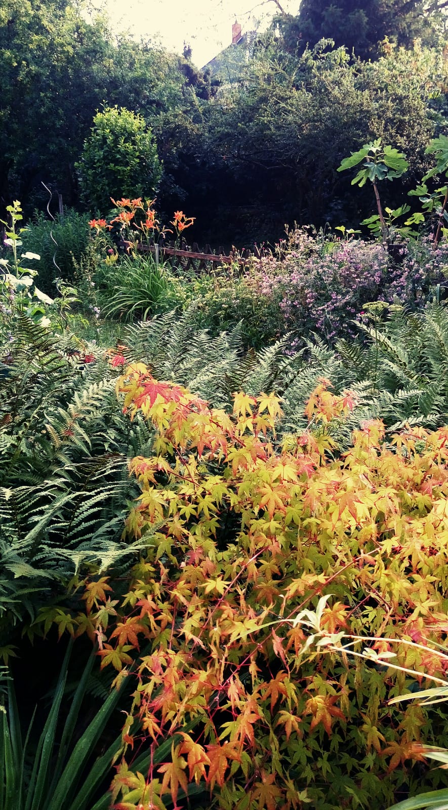 Der Garten sieht toll aus und unaufgeräumt finde ich ihn jetzt nicht gerade. Er sieht sehr pflegeleicht aus und so viele Farne! Vorn der bunte Ahorn (?) gefällt mir super.