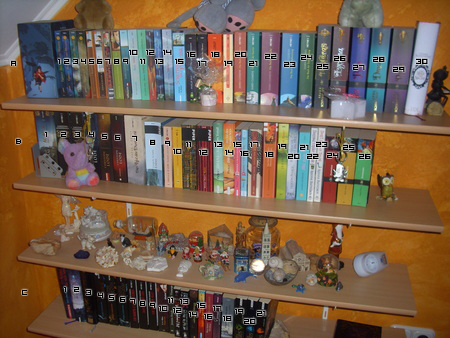 Ich hab mich mal an den Zahlen versucht. Damit diese noch gut lesbar sind, müssen die Bücher [leider] eine bestimmte Größe haben. Ich hab jetzt mal ein Foto genommen, bei dem es noch recht gut geht.