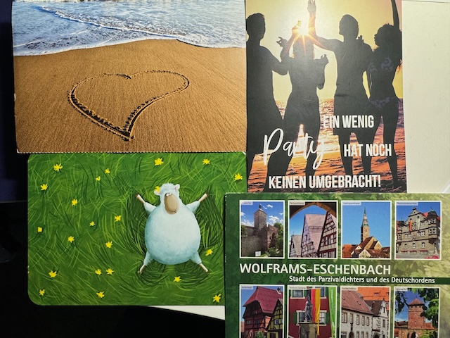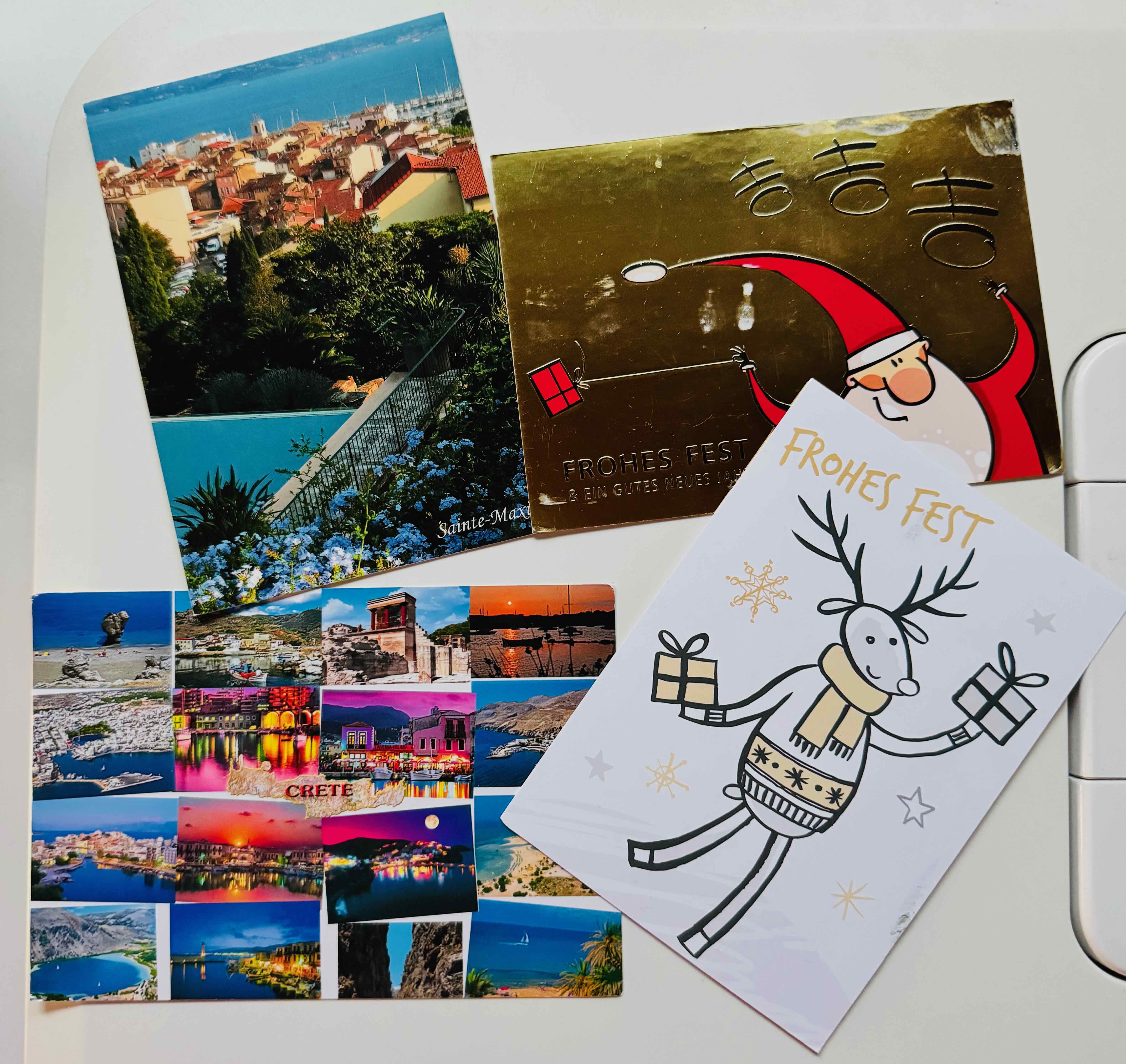 Danke an Alle für die Karten in 2024 und ich bin jetzt erst einmal auf "Pause". Ich möchte weniger Dingen "verpflichtet" sein für nächstes Jahr. Und mehr Bücher lesen können, dafür muss anderes pausieren oder ich muss mich und meine Zeit neu sortieren. Oder wie auch immer man das so sagt. Mein Mann war krank und da ist einiges im Umbruch, weil die Rente für ihn in greifbarere Nähe rückt. Zwei Kinder werden voraussichtlich mit ihrer Ausbildung fertig und gehen ihrer Wege. Das ist spannend, aber ich möchte daneben möglichst wenig auf meiner to-do Liste. Und da ich seit Jahren Postkarten bei Postcrossing schreibe, bleibe ich erstmal dieser Plattform treu und bedenke mit Schreiben auch zuerst einmal meine Freundinnen die ich schon ewig kenne. ALLES geht einfach nicht (gut), da werde ich nicht mehr der Sache gerecht. Danke für die schöne Zeit mit euch, aber "Pause" ist ja auch kein Abschied für immer