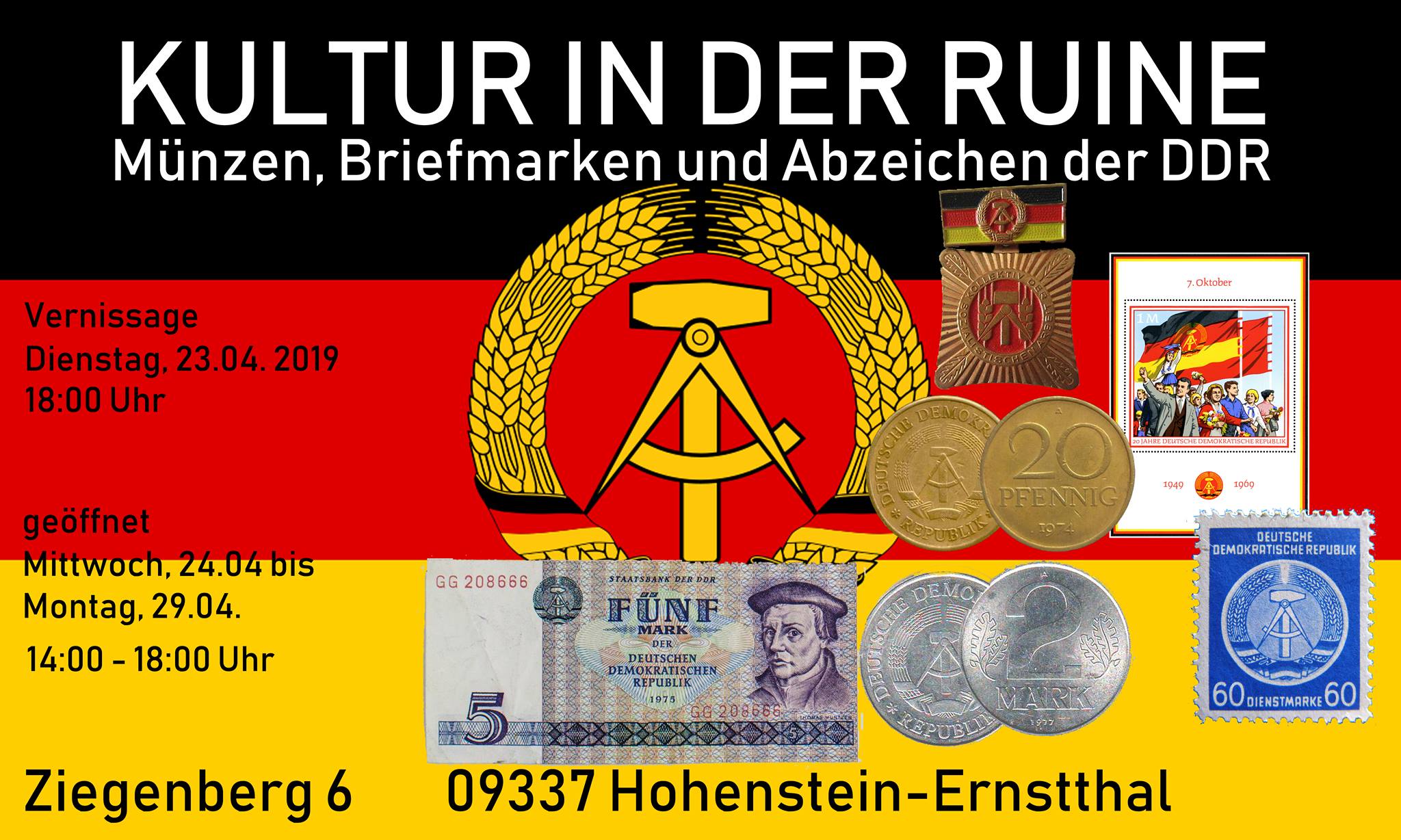 Am 23.04. um 18:00 Uhr findet in der Galerie "Kunst in der Ruine" die Vernissage "Münzen und Briefmarken der DDR" statt.