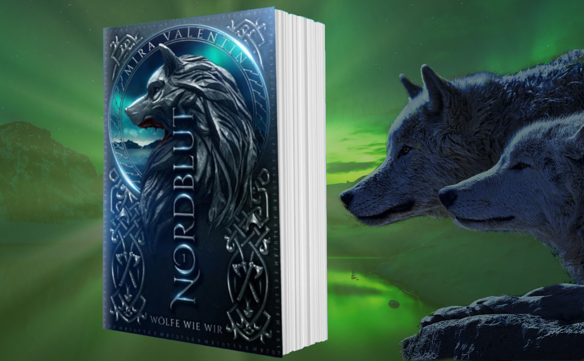 Bild zeigt das Buchcover (mit freundlicher Genehmigung der Autorin) / Hintergrund Wölfe und Polarlichter über Island, Quelle: pixabay