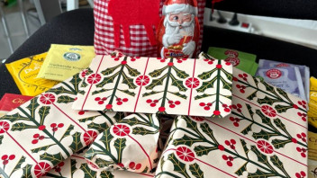 ein hübsches Säckchen mit "Nervennahrung": Traubenzucker, Schoki-Weihnachtskugeln, Kaugummi und Proteinriegel