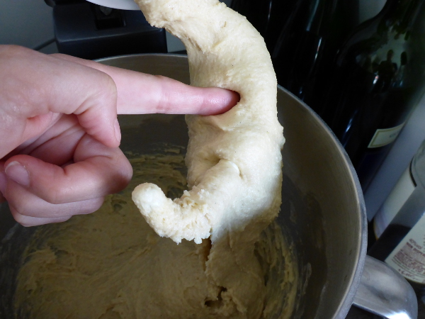 Wie im Buch gefordert, habe ich alle Zutaten gleichzeitig mit dem Knethaken zu einem gleichmäßigen Teig verarbeitet. Die einzige Abweichung ist, dass ich Trockenhefe statt frischer Hefe verwendet habe.Das Aufarbeiten