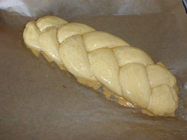 Dementsprechend gut ließ sich der Teig auch rundwirken für die erste Gehzeit. Danach teilen und in Stränge formen und die Stränge flechten. Den geflochtenen Zopf habe ich dann wie gefordert mit verquireltem Ei bestrichen und nochmal gehen lassen. Auf das Abdecken habe ich aufgrund der angenehmen Außentemperatur und angesichts der Eistreiche verzichtet.Das Backen