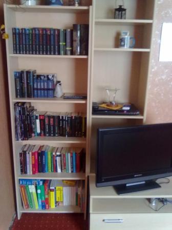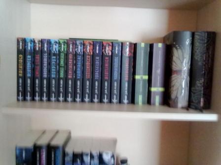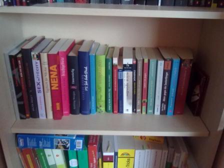So jetzt komme ich mal mit meinem mikrigem Bücherregla um die Ecke. Es sind "nur" ca. 75 Bücher, ohne den letzten Regalboden mit schul und Fachbüchern. Aber da wir noch nicht den Platz haben kauf ich derzeit auch keine Bücher, außer natürlich die die unbedingt sein müssen.